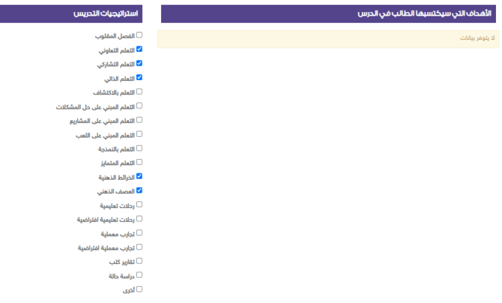 1⃣ إضافة الوسائل المستخدمة - التهيئة - الأهداف - مفردات الدرس - الاستراتيجيات - مهارات التفكير -إغلاق الدرس.